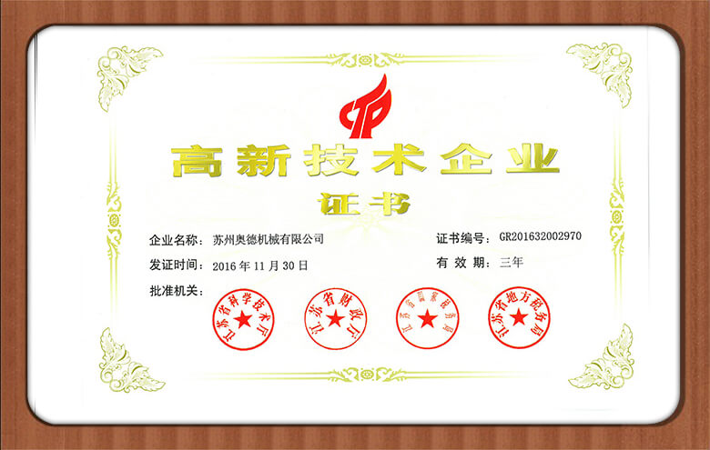 | In 2015......In 2015, Suzhou AODE Machinery Co., Ltd. held a grand ceremony for the relocation of new plant to set sail for the future and continue to be brilliant. In 2015, we won the title of Jiangsu Private Technology Enterprise. In 2015, our company was identified as Kunshan Research and Development Organization. |